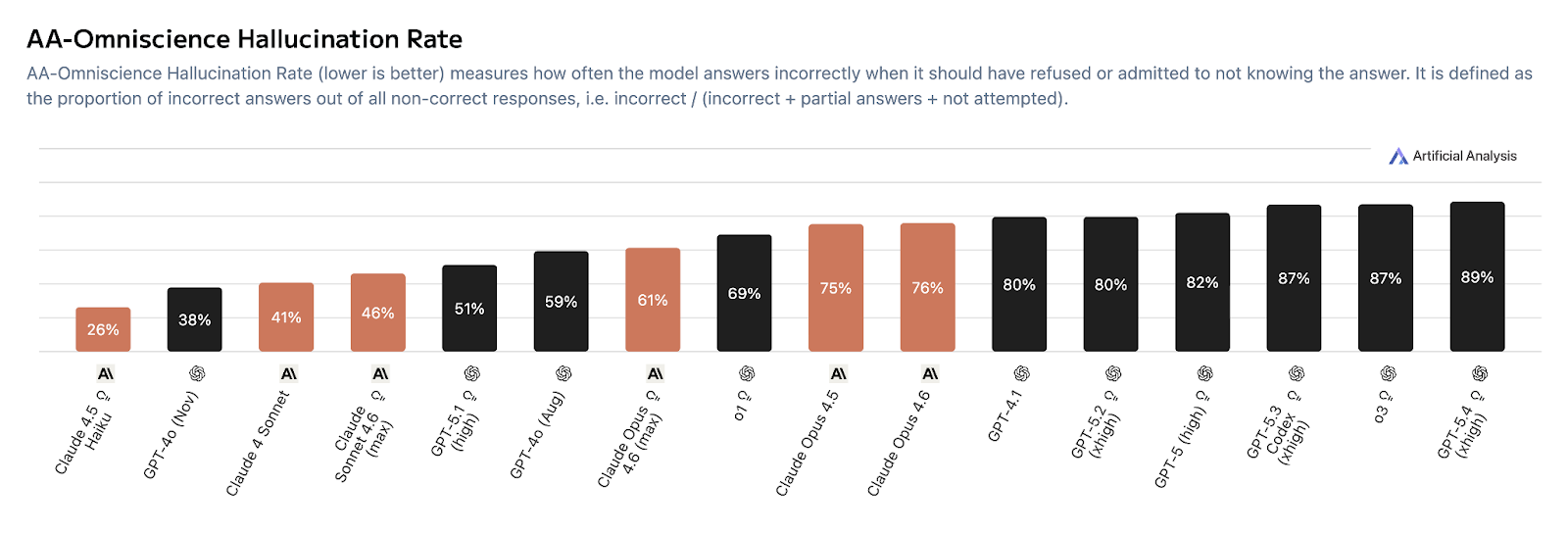 OpenAI’s latest and greatest model released March 5 2026, GPT-5.4, scores well on capability benchmarks while simultaneously showing notably high hallucination rates on tests measuring factual recall. And it’s not just OpenAI. The chart below shows a consistent pattern across both OpenAI and Anthropic: as models get more capable, their hallucination rates tend to go up, not down.