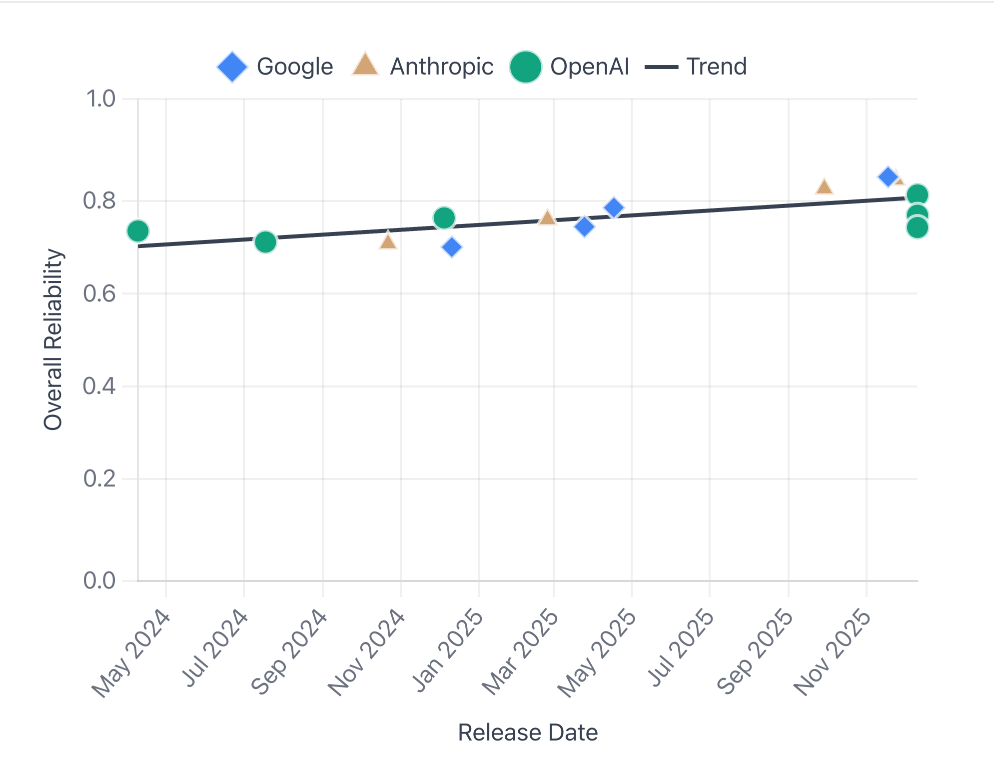 “Towards a Science of AI Agent Reliability”, from Stephan Rabanser, Sayash Kapoor, and Arvind Narayanan, evaluated 14 models from OpenAI, Google, and Anthropic across 18 months of releases. Their core finding was that nearly two years of rapid capability progress produced only modest reliability gains.